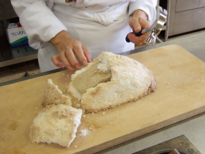 塩釜の余熱で蒸し焼きにすることで、肉がやわらかくなり、また余分な脂も吸い取ってくれる、塩釜の特性を利用した料理です。もちろん中に入れるものは魚…鯛やスズキでも、鶏肉でもいいですよ。その場合はセージ、ペンネル、ローズマリーなど、ハーブ類を変えてみましょう!